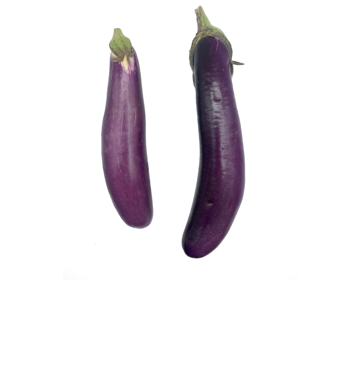Chinese eggplants are long and thin, averaging 15-20 centimeters in length and 5 centimeters in diameter. its thin outer skin ranges from violet to bright purple. The inner flesh is cotton white, semi-firm, and nearly seedless. Chinese eggplants have a mild and sweet flavor without the bitterness associated with eggplant.