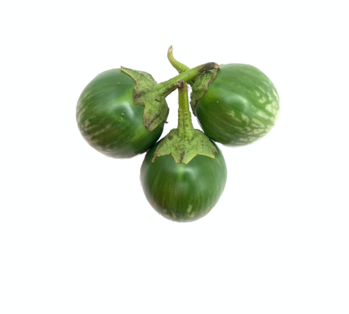 Thai eggplants can have an elongated, cylindrical shape to a small, globular shape, averaging 2-3 centimeters in diameter. The vivid green hues begin at the fruit's stem and then fade to a creamy white in a striping pattern. Thai eggplants are crunchy and mild with a slightly bitter taste.