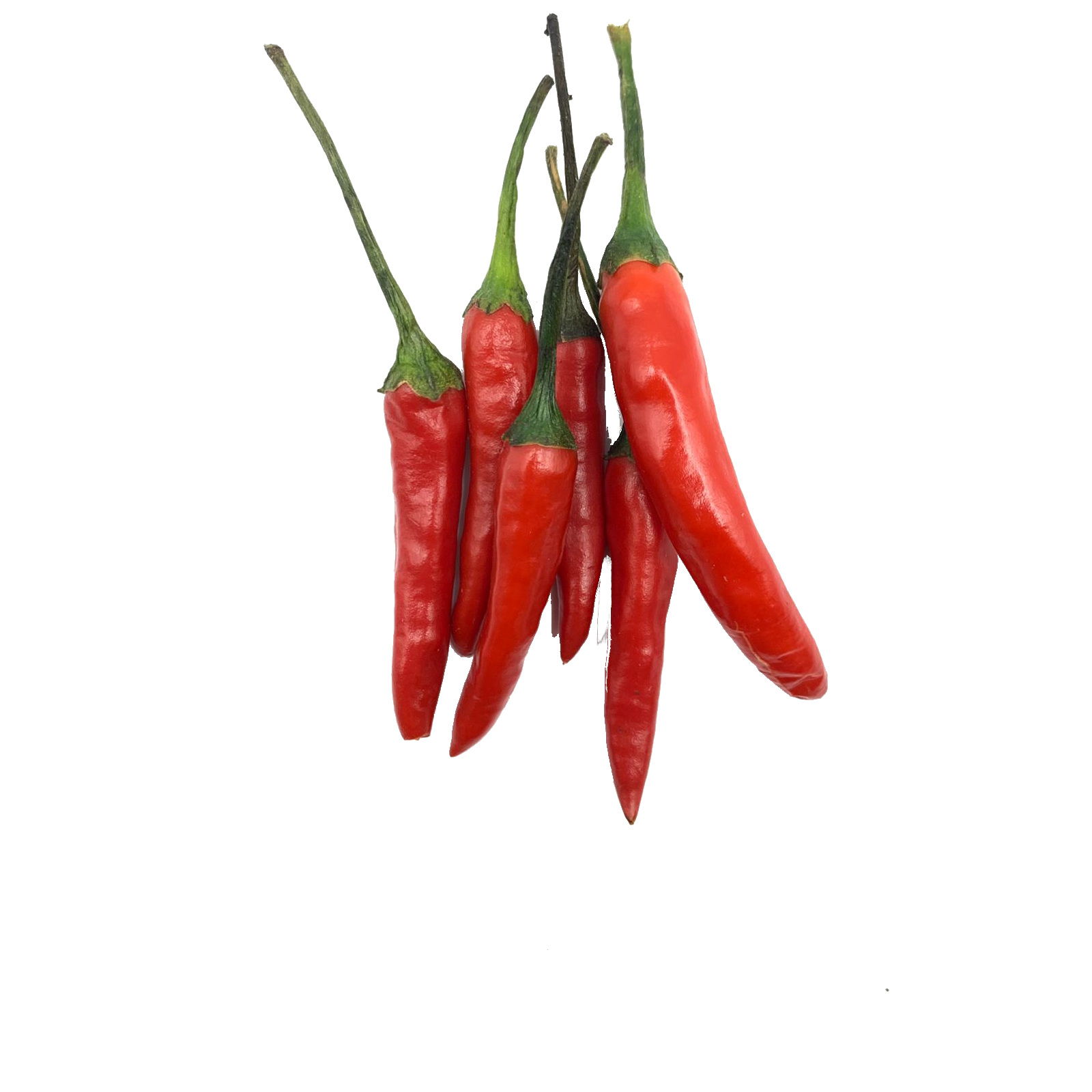 Red Thai chile peppers vary in size and shape, depending on the specific variety, and are generally small, conical, and slender, tapering to a point on the non-stem end. The pods range in length from 2 to 7 centimeters, and the skin is smooth, taut, and waxy, ripening from green to bright red when mature. Red Thai chile peppers have a fruity, subtly earthy flavor with a pungent heat that slowly builds and then lingers on the palate.